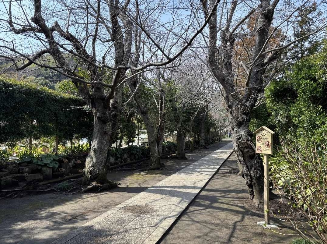 裏門を出て左手に進み、稲村ヶ崎小学校のグランドを通って奥の階段を上った先にあります。